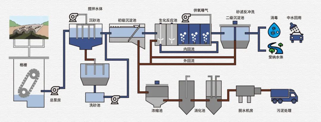 生化处理后的混合液进入二级沉淀池。上层清水经砂滤、消毒后,可实现中水回用或达标排放。沉淀的活性污泥部分回流至生化池,剩余进入污泥处理系统。
